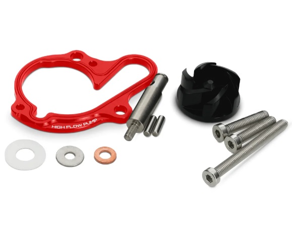 Das VOCA HighFlow Kit ist ein Upgrade für das Kühlsystem von Derbi Euro 3 und 4 Motoren. Durch ein größeres CNC-Flügelrad wird die Durchflussmenge des Kühlmittels erhöht, was die Motortemperatur bei getunten Setups senkt. Der Clou ist der mitgelieferte CNC-Spacer in rot, wodurch der Standard-Wasserpumpendeckel weiterverwendet werden kann. Es handelt sich um ein Plug-and-Play-Komplettset inklusive aller Dichtungen und Kleinteile, es sind keine Anpassarbeiten am Motor nötig.